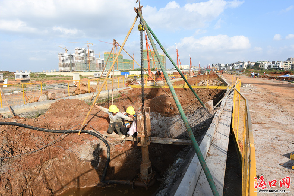 ??诰W12月2日消息(記者石中華 攝影報道)12月2日,??谑泻P憧焖俾范陧椖拷ㄔO段一片繁忙,工人們正在進行高架橋樁基施工工作。