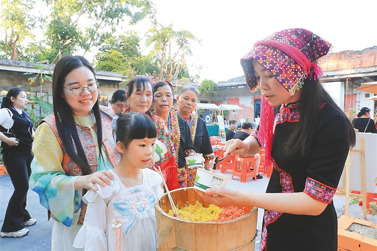 12月7日,在儋州市“聚焦苗族文化瑰寶,開啟指尖上的藝術之旅”活動上,觀眾前來觀摩品鑒苗族三色飯。