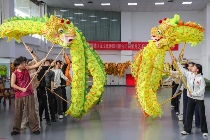 “跑的時候注意站位,把身形穩住!慢八字舞龍的時候龍頭要注意照顧好龍尾的節奏,不要搶!”重慶銅梁龍藝術團訓練室里,團長蔡明燦正在一旁悉心指導舞龍隊隊員進行競技舞龍訓練。