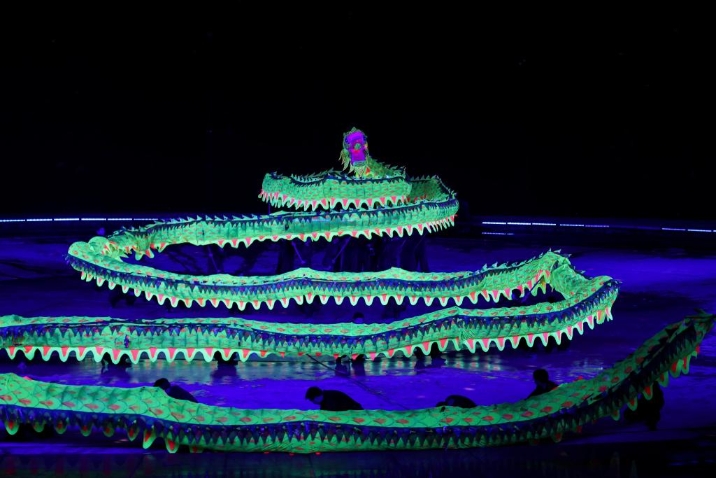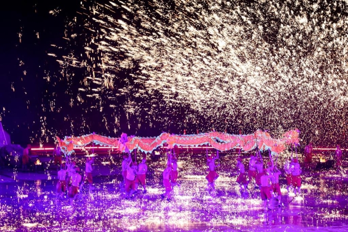 這是12月6日在銅梁區玄天湖龍舞廣場拍攝的《追夢·銅梁龍》演出現場?!蹲穳簟ゃ~梁龍》融合水云龍、荷花龍、鐵花火龍等多樣龍舞。