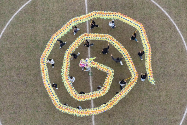 12月6日,重慶銅梁龍藝術團競技舞龍隊隊員在“渝超”賽場排練(無人機照片)。