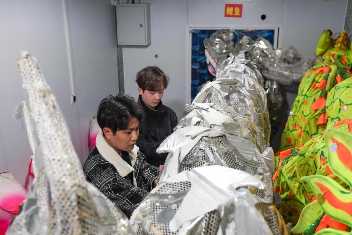 12月6日,在銅梁區玄天湖龍舞廣場,重慶銅梁龍藝術團競技舞龍隊隊員魏燁(左)、秦新松在演出前檢查表演道具。