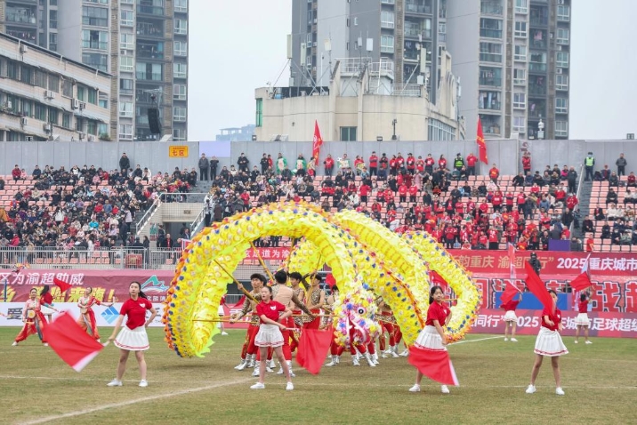 12月6日,重慶銅梁龍藝術團競技舞龍隊隊員在“渝超”賽場進行暖場表演。