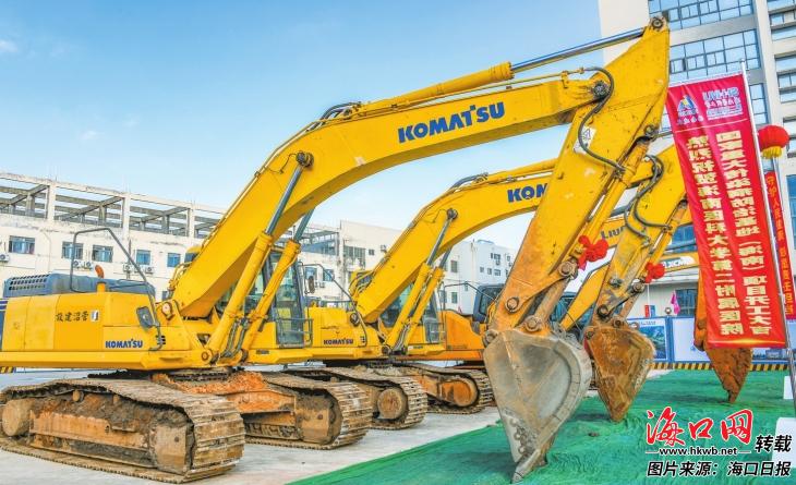 12月12日,國家重大傳染病防治基地(海南)項目在海南醫科大學第二附屬醫院開工奠基。圖為開工奠基儀式現場,大型機械設備準備就緒。記者 康登淋 攝