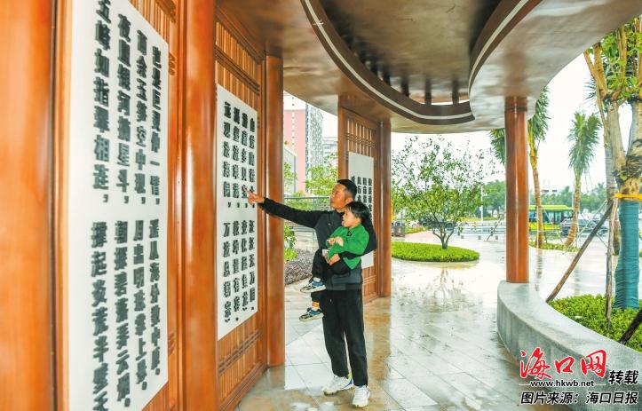 在瓊山區書香園中,家長帶著孩子在文化長廊里游覽。